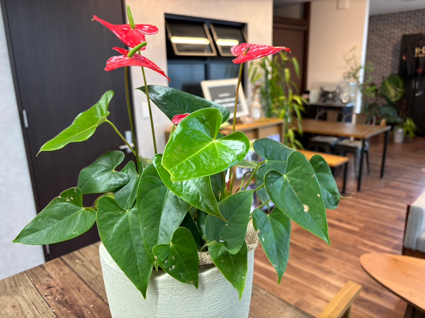 特にアンスリウムは、ツヤツヤの新しい葉がどんどん出てきています。花に見える赤い苞も次々と顔を出しています。 生命力に溢れた緑色の葉を見ていると、私たちも元気をもらえます!